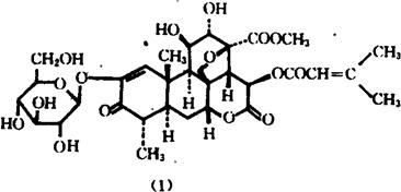 | 释义 | 鸦胆子 【概况】: 异名 老鸦胆(《生草药性备要》),鸦胆、苦榛子(《吉云旅钞》),苦参子(《纲目拾遗》),鸦蛋子(《植物名实图考》),鸭蛋子(《医学衷中参西录》),鸭胆子(《中药志》),鲜苦楝(《广西中药志》),小苦楝(《广西中草药》)。 基源 为苦木科鸦胆子属植物鸦胆子的果实。鸦胆子属全世界有6种;中国有2种,1种供药用。 原植物 鸦胆子Brucea javanica(L.)Merr. 历史 鸦胆子之名出于(《本草拾遗》),载:“鸦胆子出闽广,……形如梧子,其仁多油,生食令人吐。”至圣丹下又载:“此物出闽省云贵,虽诸家本草未收,而药肆皆有,其形似益智子而小,外壳苍褐色,内肉白,有油,其味至苦。用小铁锤轻敲其壳,壳破肉出,其大如米,敲碎者不用,专取全仁用之。”等等。其所记载均与现时华南盛产而畅销全国的一种苦木科植物鸦胆于的果实相吻合。《植物名实图考》作鸦蛋子,但所附图却是大戟科的一种植物,可能是草沉香《中药大辞典》Excoecaria acerifolia Didrich. 形态 灌木或小乔木,高达3m,全体均被黄色柔毛。 单数羽状复叶,互生,长20~40cm,小叶5~11枚,通常7枚,卵状披针形,长5~10cm,宽2~4cm,基部宽楔形而常偏斜,顶端短渐尖,边缘有粗锯齿。 圆锥花序腋生,雌雄异株,雄花序长15~25cm,雌花序长为雄花序的1/2左右;花小,暗紫色;萼4裂,裂片卵形,花瓣4,长椭圆状披针形;雄蕊4,著生于花盘之外,子房4深裂。核果椭圆形,黑色,具突起的网纹。花期3~8月,果期4~9月。 (图见《中国高等植物图鉴》.第2册.562页.图2854) 生境与分布 生长于草地、灌丛及路边向阳处。分布于福建、台湾、广东、广西、云南。。 【生药】: 栽培 宜温暖气候,不耐寒,能耐旱。 对土壤要求不严,但以土层深厚、富含腐殖质的砂质壤土为好。种子繁殖,于10月秋播或3~4月春播,点播或条播,株行距50~60cm,深3cm左右,每穴播种子5~6粒,播后覆土浇水,保持土壤湿润。幼苗出土后,结合中间除草,施人畜粪水或氮素化肥2次。 培育1年后定植,点播每穴留1~2株苗;条播按株距定植。 生长前即口施氮肥,开花期须施1次磷钾肥。结合松上除草促进分枝,增加开花结果量。 每年冬季使植株矮化,多分枝,提高产量。 采集 通常于8~10月果实成熟时采收果实,除去杂质,干燥。药材主产于广东博罗、海康、茂名、龙川、澄海,海南、乐东,广西合浦、钦州、横县、博白,福建、台湾亦产。以广东产量为大,质量为佳。 鉴别 性状 核果卵形或椭圆形,两头稍尖,略扁,长3~10mm,直径4~7mm;表面黑色或棕色,有隆起的网状皱纹,顶端有鸟嘴状短尖的花柱残基,腹背两侧有较明显的棱线,基部有凹点状的果柄痕。外壳质硬而脆,破开后内面灰红色或灰黄色,光滑而油润。 种子卵形,表面类白色或黄白色,具网纹,种皮薄,种仁乳白色,富油性。无臭,味极苦。以粒大、饱满、种仁色白、油性足者为佳。 显微 果实横切面:外果皮表皮细胞较小,有气孔;其内为2~3列类方形薄壁细胞,含红棕色物。 中果皮为6~20余列类圆形薄壁细胞,含草酸钙簇晶,直径12~50μm;中部有维管束环列。内果皮由2条石细胞环带及1条厚壁细胞环带构成,向外形成多个角状突起;外侧环带为1~5列大形石细胞,类圆形或方圆形,直径25~75μm,纹孔和孔沟明显;中部环带为1~6列厚壁细胞,壁稍木化,纹孔及孔沟不明显,内含棕黄色物,近内侧的胞腔内含草酸钙方晶,直径8~30μm;内侧环带最宽,为多列纵横交织的石细胞群。 种皮表皮细胞1列;其内为营养层薄壁细胞及粘液层;胚乳及子叶薄壁细胞充满糊粉粒和脂肪油。(图见《中药志》.第3册.第2版.530页.图335.336) 理化 取样品脱脂粉末4g,于水浴上用水提取2次,合并水提取液浓缩至10ml,用氯仿萃取2次(10ml.5ml),合并氯仿液,浓缩至1ml,点于硅胶G板上,以鸦胆子苦醇为对照,对氯仿-甲醇(9∶1)为展开剂,展距14cm,喷5%三氯化铁乙醇溶液,可见3个蓝紫色斑点。(图见同上.337页.图337) 加工炮翻 取原药材,除去杂质,用时去壳。 贮藏 置阴凉干燥处。 。【化学】: 果实、种子含脂肪油,有软脂酸(Palmitic acid)、硬脂酸(Stearic acid)、亚油酸(Linoleic acid)、十七碳烷酸(Heptadecoic acid)、花生酸(Arachidic acid)[1]、油酸、三油酸甘油酯[2]。 还含鸦胆子苦醇(Brusatol)[3,4]、鸦胆子苦素A、B、C、D、E、F、G、H、I(Bruceine A、B、C、D、 E、F、G、H、I)[3~12]、鸦胆子辛(Javanicin)[20]、去氢鸦胆子苦素B(Dehydrobruceine B)[4]、鸦胆子苦烯(Bruceene)[13]、鸦胆子甙A(Bruceoside A)(1)、鸦胆子甙B(Bruceoside B)[7]、胡萝葡甙(Daucosterol)[6]、鸦胆子苦素E-葡萄糖甙(Bruceine E-glucopyranoside)[14]、槲皮素-3-O-β-D-半乳吡喃糖甙、木犀草素-7-O-β-D-葡萄吡喃糖甙[12]、新苦木素鸦胆子酮酸(Bruceaketolicacid)[4]、4-乙氧甲酰基喹诺-2-酮(4-Ethoxycarbonyl-2-quinolone)、香草酸[12]、鸦胆子内酯A(YadanziolideA)[15]。种子含鸦胆亭(Bruceantin)[18]、鸦胆亭醇(Bruceantinol)[19]、鸦胆子碱(Brucamarine)、鸦胆宁(Yatanine)[21]、4-乙氧甲酰基喹诺-2-酮[6]。还含鸦胆子甲素[6]。 附 根含鸦胆子苦醇、没食子酸乙酯(Ethyl gallate)、大黄素(Emodin)、大黄酚(Chrysophanol)、大黄酚葡萄糖甙(Chrysophanein)、β-谷甾醇(β-Sitosterol)[16]。茎含鸦胆子苦醇、没食子酸乙酯、大黄酚,大黄酚甙(Chrysophanein)、β-谷甾醇[17]。