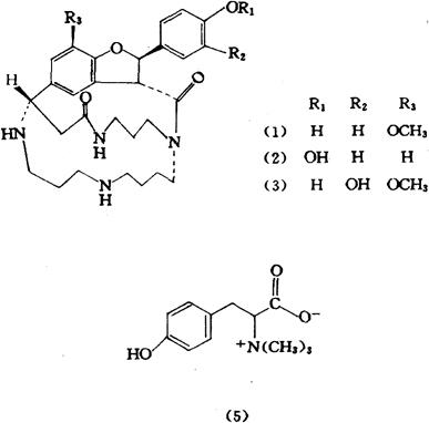 | 释义 | 麻黄根 【概况】: 异名 苦椿菜(《大同府志》)。 基源 为麻黄科麻黄属植物草麻黄、木贼麻黄及中麻黄的根及根茎。 原植物 草麻黄Ephedra Sinica stapf.木贼麻黄E.equisetina Bge.及中麻黄E.intermedia Schrenix et Mey. 余项参见“麻黄”条。 。【生药】:采集 立秋后采挖根及根茎,去净细根及茎苗,晒干。 药材主产于内蒙古、辽宁、山西、河北、陕西、甘肃。 鉴别 根圆柱形或圆锥形,稍扭曲,长约20cm,直径约2cm;表面红棕色,有明显的纵沟,根茎有突起的节。质坚硬,纵劈之,内部有众多纵行的纤维,横断面木部有很多空隙,从中心向外放射,色淡黄。无臭,味微苦。 以质硬、外皮色红棕、断面色黄白者为佳。 贮藏 置通风干燥处。 。【化学】:麻黄根、花、果、种子中,均不含苯丙醇胺类生物碱[1]。 麻黄根中得到大环精胺类的麻黄根定碱(麻黄根素,Ephedradine)A(1)、B(2)、C(3)、D(4),阿魏酰组胺(Feruloylhistamine),均具降压活性[2~4];麻黄根中分出的麻黄根碱(麻黄根宁,麻根素,Maokonine,L-Tyrosine betaine)(5),具有升压活性[5];另外,麻黄根中含有的黄酮醇黄烷醇双分子化合物麻黄根宁A(Ephedrannin A)[6]及多种双黄烷醇类化合物麻黄宁(Mahuannin)A、B、C、D,亦具降压活性[7~10]。