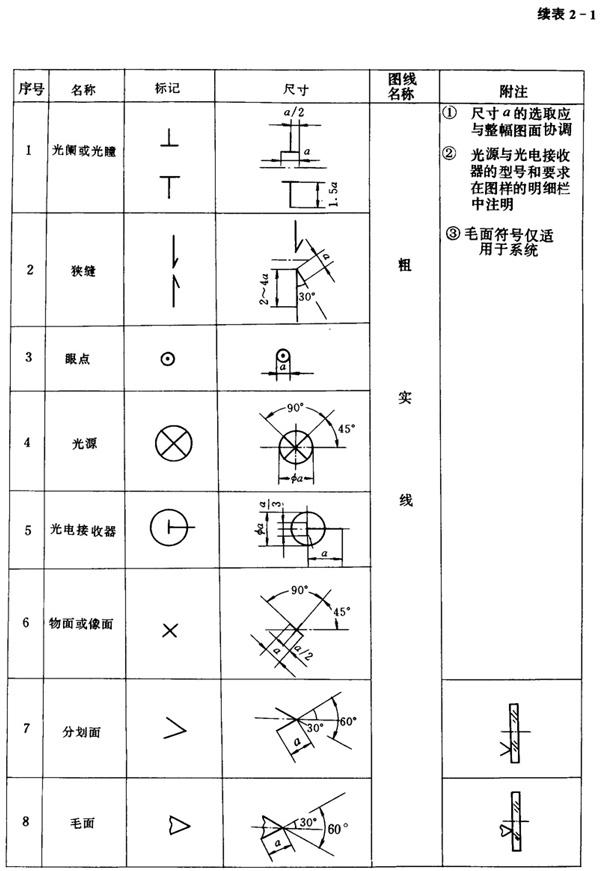 1.1 除本标准规定外,光学图样的幅面、比例、字体、图线、剖面符号、图样画法、尺寸、尺寸公差与配合及表面粗糙度的注法等,应按GB4457~4460和GB131的规定执行,而倒角按GB1204的规定执行。 1.2 在光学图样上光轴用细点划线,光轴中断线用双波浪线〔见附录A(参考件)图2-A1〕。 1.3 在光学图样上,零件的有效孔径应在所列表格的“D0”栏内标明。圆形注:“φ直径”,例“φ30”;方形注:“□边长”,例“□10”;矩形注:“□长×宽”,例“□30×20”;椭圆注:“〇长轴×短轴”,例“〇30×20”等。 1.4 光学零件表面上需要表明有特殊要求的范围,用细实线或涂色画出其范围,并予以说明(见图2-1)。 1.5 光学纤维件的剖面画法见图2-2 1.6 光学晶体的剖面和光轴(C轴)的画法见图2-3 1.7 光源、光栏和镀膜等符号规定见表2-1。 表2-1   1.8 标题栏和明细表分别参照GB10609.1和GB10609.2。 |
