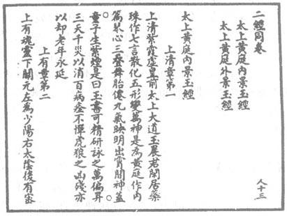 | 释义 | 黄庭 道教有两部著名经典《上清黄庭内景经》和《上清黄庭外景经》,统称“黄庭”。 这两部书都用七言歌诀讲述养生修炼原理,为历代道教徒和修身养性者所重视。道教全真派并以讲习《黄庭》作为自己的重要功课。 “黄庭”是一个道教术语,“黄”代表天地的正色,“庭”代表四方的中央;“黄”主脾,主中央,示人身中部位;“庭”为阶前空地,可引申为“空”。故人们有时也用《黄庭》代指一切关于道教修炼养生理论的典籍。