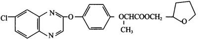 | 释义 | 35.喹禾糖酯 中文通用名称:喹禾糖酯,英文通用名称:quizalofop-P-tefuryl,其他名称:糖草酯、喷特、Pantera,化学名称:(R)-2-[4-(6-氯喹喔啉-2-基氧)苯氧]丙酸-(RS)-四氢糖酯,化学分子式:C22H21ClN2O5,相对分子量:428.9。 化学结构式: