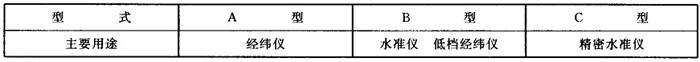 该标准规定了大地测量仪器用分划板的基本型式及主要尺寸要求。不适于大地天文测量仪器用分划板。 4.1 基本型式及主要参数 4.1.1 基本型式及主要参数 基本型式及主要参数见图4-4。 4.1.2 主要用途 主要用途见表4-31。 表4-31 不同类型大地测量仪器的用途  4.2 尺寸要求 (1)分划板刻划线DD、D′D′之间的距离应符合于乘常数等于100。 (2)分划板的分划线也允许是通过分划板中央的连续直线。 (3)C型分划板的V型线和横线组成的上下两夹角,其角度之差不大于5′。 |