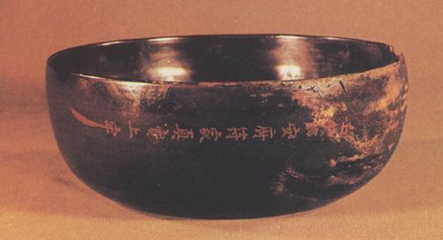 此碗没有饰件,给人以古拙之感,做工精湛,自然平整。该碗系一色漆器,表里均髹黑漆,漆膜稍有脱落,色泽光亮,精光内含,朴素而高雅。
