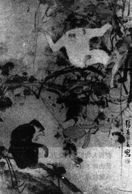 | 释义 | 黑白猿 【作品赏析】: 一只黑猿和一只白猿在秋树上攀援。 黑猿蹲在树干上,似乎发现了什么,张口大叫。白猿坐在上枝,忙回头省识,神态中流露出关切。黑猿刚健,白猿轻秀。一通身皆黑,毛皮也有硬的感觉;一通身洁白,温和有趣。 画家赋予猿猴以人的性格和特征,动态生动,自然,非黯熟猿类生活者不能有如此描绘。在画法上,猿以工笔细描细染画出,环境——秋树枝叶、藤条等,则以粗笔写意法写出,工整精致与阔笔挥扫点染统一在一起,毫不生硬。秋色萧萧,几片硕大的红叶娇艳如花,黑白猿有如顽童戏玩,画面洋溢著生意和神采。 。【作者介绍】: 张其翼(1915-1968)字君振,祖籍福建闽侯。 少年时,曾受教于著名书画家李剑伯、金拱北。16岁参加“湖社”。1938年毕业于辅仁大学美术系,1946年任中国美术会常务理事。 建国后多有花鸟作品出版,曾与齐白石、陈半丁、于非闇等合作《和平颂》。 1956年起任天津河北艺术师范学院美术系讲师。其为人诚笃,性率真,痴心于画,创作时通宵达旦。 工笔、写意花鸟及猿猴俱功力深厚,独树一帜。著有《我怎样画翎毛》,有《张其翼画集》刊世。 。