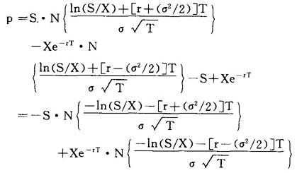 其中r:无风险利率,σ2:期权的方差,其他符号解释同上。 默顿认为:由于标的股票支付红利,所以这一解不能应用于美式看涨期权的定价上,在这种情况下,美式期权总存在著提前履行的可能性。 3.默顿的跳跃模型 默顿认为:股票价格的连续变动部分的原型为维纳过程,而跳跃部分的原型为泊松过程。存在两种特殊情况可导出简化解。第一种为萨缪尔森在1973年描述的股票价格存在瞬时灭失的正概率,即如果泊松事件发生,则股票价格趋近于0。 在这种情况下,F(S,τ)=e-λτW(Seλτ,τ;Ε,σ2,r)=W(S,τ;Ε,σ2,r+λ),其中W(S,τ;Ε,r,σ2)为无跳跃时的布莱克-斯科尔斯模型,E为期权的执行价格。其他符号解释同上。 此式与标准的布莱克-斯科尔斯解相同,但具有较大的利率,r′≡r+λ。默顿曾证明,期权价格为利率的增函数。 因此,有完全灭失正概率股票的期权价值比无此种形式的期权价值高。此结论证实萨缪尔森的推测。 第二种为随机变量Y服从对数正态分布,则: 此为默顿的跳跃模型。 4.默顿的看跌期权定价模型 其一般均衡约束条件为:(1)一个看跌期权在到期日将取执行价格减股价之差与零的最大值,即P(S*,0;X)=p(S*,0;X)=Max[0,X-S*]。(2)当借贷利率相等时,一个欧式看跌期权与一个由相同条件的欧式看涨期权、面值为X的无风险债券和卖空股票所组成的投资组合等值。 可导出欧式看涨和看跌期权之间的平价关系为:p(S,T;X)=c(S,T;X)-S+XB(T)。(3)一个欧式看跌期权的价格一定小于等于面值为X的完全折现债券价格,即p(S,T:X)≤XB(T)。 (4)一个无股息永久性欧式看跌期权的价值一定为零,即p(S,∞;X)=c(S,∞,X)-S+XB(∞)=S-S+0=0。(5)如果标的股票价格为零,则欧式看跌期权的价值等于执行价格的现值,即p(0,T;X)=0-0+XB(T)。 (6)一个美式看跌期权的价格要大于等于相应的欧式看跌期权的价格,即P(S,T;X)≥p(S,T;X)。根据欧式看涨和看跌期权的平价关系可导出看跌期权定价模型: