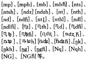 由口辅音加鼻辅音构成的声母。汉藏语系许多语言都有这类声母。鼻辅音有[m]、[n]、[η]、[η]、[N]、[n]等,与之组合的口辅音声母有塞音、塞擦音、塞边音等。二者的发音部位往往相同。鼻辅音的清、浊、送气不送气往往与口辅音一致。如苗语川黔滇方言(以贵州威宁石门坎话为例)之中的鼻冠音声母比较多,并且也比较整齐,例如