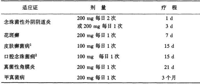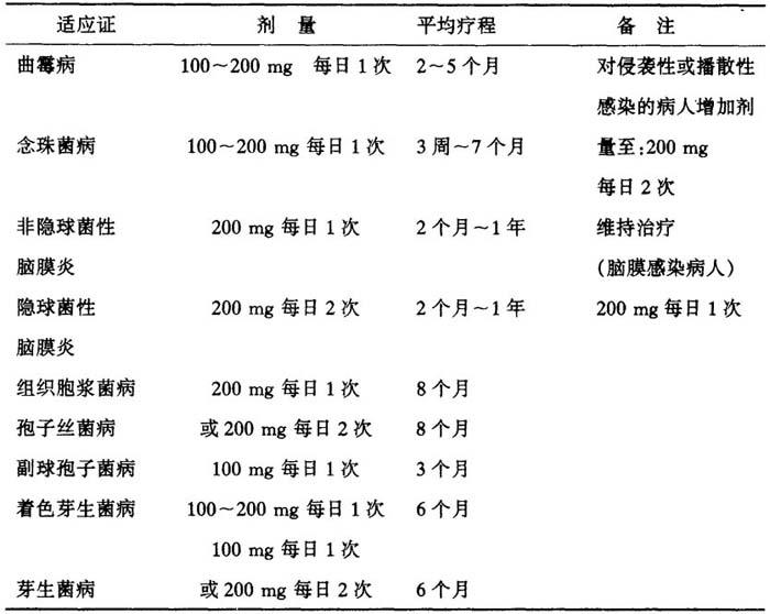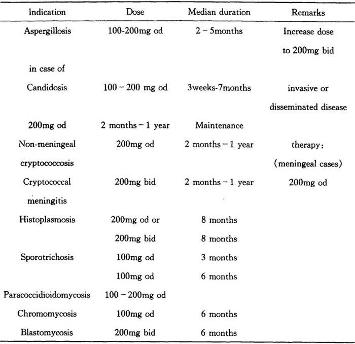 高度角化区,如足底部癣、手掌部癣需延长治疗15日,100mg/d 一些免疫缺陷病人如白血病、艾滋病或器官移植病人,伊曲康唑的口服生物利用度可能会降低,因此剂量可加倍 本品从皮肤和甲组织中清除比血浆慢,因此,对皮肤感染来说,停药后2~4周达到最理想的临床和真菌学疗效,对甲真菌来说在停药后6~9个月达到最理想的临床和真菌学疗效。 全身性真菌病:(根据不同的感染选择不同的剂量用法)。 表28 根据不同感染选择不同的剂量用法