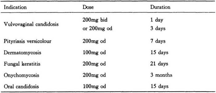 Highly keratininzed regions as in plantar tinea pedis and palmar tinea manus require an additional treatment of 15 days at100mg daily. In some immunocompromised patients,e.g.neutropenic,AIDS or organ transplant patients,the oral bioavailability of itraconazole may be decreased.Therefore,the doses may need doubling. Elimination of Sporanox from skin and nail tissue is slower than from plasma.Optimal clinical and mycological response is thus reached 2 to 4 weeks after the cessation of treatment for skin infections and 6 to 9 months after the cessation of treatment for nail infections. Systemic mycoses(dosage,recommendations vary according to the infection treated) Table 28