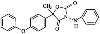 | 释义 | 8.噁唑菌酮 中文通用名称:噁唑菌酮,英文通用名称:famoxadone,其他名称:易保,化学名称:3-苯胺基-5-甲基-5-(4-苯氧基苯基)-2,4-噁唑二酮,化学分子式:C22H18N2O4,相对分子量:374.4。 化学结构式: