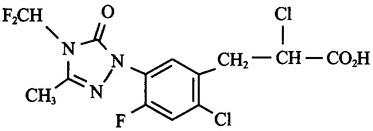中文通用名称:唑酮草酯,英文通用名称:carfentrazone-ethyl,其他名称:快灭灵、Affinity 40 DF、F8426,化学名称:2-氯-3-[2-氯-4-氟-5-(4-二氟甲基-4,5-二氢-3-甲基5-氧-1-氢-1,2,4-三唑-1-基)苯基]丙酸乙酯,化学分子式:C15H14Cl2F3N3O3,相对分子量:412.2。 化学结构式:  理化性质:纯品为黏性黄色液体,密度1.423g/cm3(25℃),沸点350~355℃,熔点为-22.1℃,蒸汽压为1.60×10-5Pa(25℃)。溶解度(25℃):水22mg/L,甲醇1.06g/mL,正己烷0.05g/mL。 毒性:大鼠(雌)急性口服LD50为5143mg/kg,急性经皮LD50>4000mg/kg。 农药类别:低毒三唑啉酮类除草剂。 |