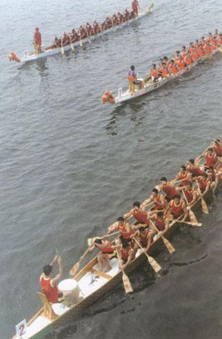 | 释义 | 龙舟 龙舟,即是船上画著龙的形状或做成龙形的船。 赛龙舟是中国民间传统水上体育娱乐项目,已流传两千多年,多是在喜庆节日举行,是多人集体划桨竞赛。龙舟赛在中国开展的比较普遍,已形成一年一度的“龙舟节”。龙舟船的大小因地而异;比赛是在规定距离内,同时起航,以到达终点先后决定名次。 龙舟赛历史悠久,传入国外后,深受各国人民的喜爱并形成了国际比赛。 1983年,中国首次派队参加国际龙舟大赛,一举夺得全部两项冠军。1984年国际龙舟大赛在中国香港举行,有美国、德国、日本、英国、新西兰、新加坡、泰国、马来西亚、澳洲、中国澳门、中国香港等16个队参赛,中国队又夺得冠军。