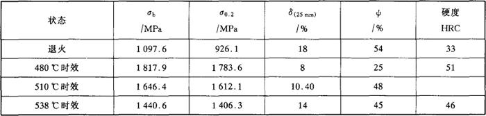 (6)工艺性能 a.热加工 在马氏体沉淀硬化不锈钢中,此钢是属于最易热加工的一种材料。热加工温度范围为900~1260℃,为获得良好的力学性能,应在1040~1150℃加热。为了获得细小晶粒和热处理后的最佳性能,终加工温度应在815~950℃。 b.冷加工 尽管此钢在退火状态下是马氏体组织,但钢的硬度仅为30~35HRC,易于进行冷加工,钢的冷加工硬化倾向很低(见表5-45),不需中间退火即可进行较大变形量的冷加工,最终热处理前进行冷变形,可获得较高的拉伸强度和屈服强度。 c.热处理 钢的退火和时效处理制度较简单。 退火:816~843℃×30min,水冷。对大截面尺寸的钢材,为获得良好的横向性能,可采用二次退火工艺,980℃水冷后再加热到816℃水冷。对于棒、带等大多数产品没有必要采用二次退火工艺,但此工艺可获得大约30HRC的最低硬度。 时效硬化:时效硬化温度为480~540℃,时效时间为4小时,冷却方式为空冷。480℃时效可得到最高的强度水平。高温时效韧性有所改善,但伴随着强度水平的下降。可根据实际需求选择时效温度和时效时间,参见图5-10。