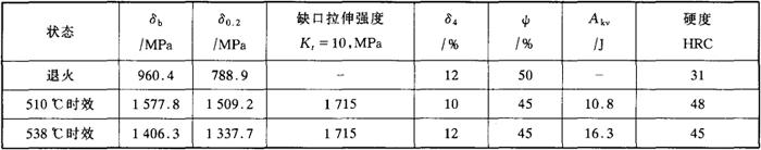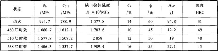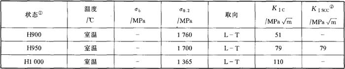 图5-11 00Cr12Ni8Cu2TiNb的室温疲劳强度 (棒材,815℃×30min水淬+480℃×4h时效空冷) 钢的断裂韧性和应力腐蚀门槛值(KISCC)见表5-47。 表5-47 00Cr12Ni8Cu2TiNb(VAR)的KIC和KISCC