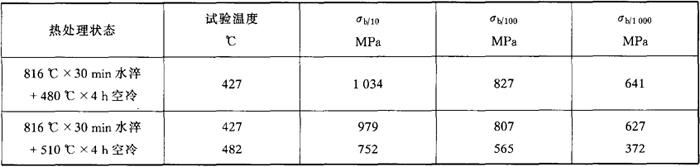 注:①980℃水淬再加热到815℃油淬退火; ②在室温3.5%NaCl中。 (5)高温力学性能 00Cr12Ni8Cu2TiNb的高温瞬时拉伸性能见表5-48。持久强度见表5-49。 表5-48 00Cr12Ni8Cu2TiNb的高温拉伸性能