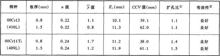 图2-4 Ti对低C、N-Cr13铁素体不锈钢γ值的影响 b.胀形性 胀形性是以延伸率和n值为指标的,它受钢的合金元素的含量和纯度的影响,Cr、C及其他元素含量愈低,纯净度愈高,胀形性愈好。低Cr铁素体不锈钢本质上Cr就低,对延伸率是有利的,因此以Cr11为基,再降低不纯物元素含量并加入微量Ti,必然具有较好的胀形性并兼备极好的深拉伸性。 表2-3示出00Cr13(410L)、00Cr11Ti(409L)成型性试验值,其成型性是良好的,特别是00Cr11Ti,γ值,Eγ值CCV值及扩孔比都好。图2-5给出00Cr11Ti、0Cr17钢板的成形极限,00Cr11Ti比0Cr17大得多。 表2-3 00Cr13,00Cr11Ti铁素体不锈钢的成型性