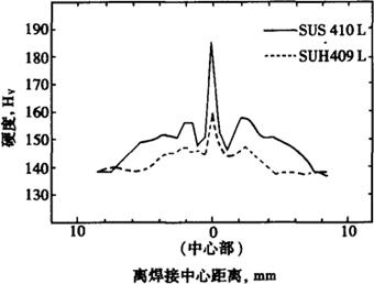 图2-5 00Cr11Ti和0Cr17钢成形极限曲线(板厚1.5mm (8)焊接性 0Cr11Ti,00Cr11Ti一般可用各种方法焊接,如钨极氩弧焊,金属极氩弧焊,电阻焊,点焊等。如需填充金属,建议用0Cr11Nb,焊接时输入的热量应该小些,避免晶粒过分长大,以免过分降低焊缝和热影响区的塑性和韧性。0Cr11Ti,00Cr11Ti钢有着较0Cr13Al,00Cr13钢好的焊接性能。图2-6示出0Cr11Ti(409),0Cr3Al(405),0Cr13(410)厚板用0Cr23Ni11(309)型焊条焊接,焊缝附近硬度的分布。0Cr11Ti焊缝附近,HAZ(热影响区)硬度几乎没有变化,没有马氏体生成,仅由于高温下单相铁素体晶粒粗化,所以00Cr11Ti厚板焊接加工时,应尽量减小输入热量,避免晶粒长大引起HAZ破裂。图2-7示出板厚1.5mm焊接,焊缝附近硬度分布,00Cr11Ti(409L)焊缝金属和热影响区是铁素体单相,硬度几乎没有变化,因此,薄板焊缝加工性能优异。图2-8示出00Cr11Ti(409L)汽车排气管高频焊,焊缝附近硬度分布,焊缝中心由于加压变形较周边硬度略有升高。高频焊与电弧焊不同,几乎看不出溶融凝固处。高频焊管性能示于表2-4,有着优异的延伸率和加工性,用作排气管等加工无特殊困难。