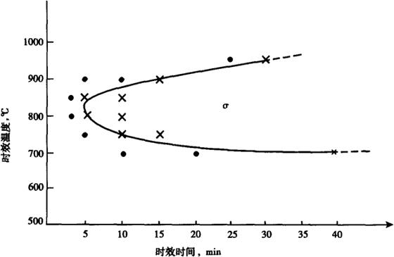 注:①表中为变形材的化学成分。 ②UNS S32550(Ferralium alloy 255)的成分是根据ASTMA 240-99a标准。 Ferralium alloy 255最早用于铸钢,后经调整了成分已大量用于变形材,关键是加氮和控制铜元素,目前铸钢的铜一般控制在不大于3.0%,对变形材则控制在不大于2.0%。 b.钢的组织稳定性 0Cr25Ni6Mo3CuN钢的两相比例随加热温度的升高,γ相减少,但至1200℃时仍保留有37%的γ相。 0Cr25Ni6Mo3CuN钢的σ相等温转变曲线见图4-55。