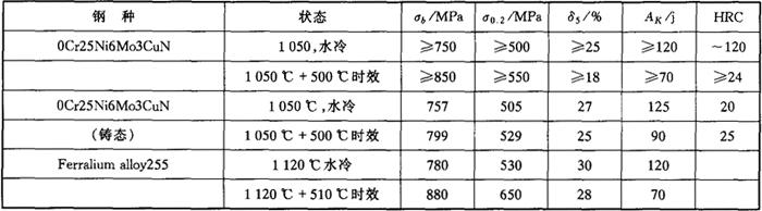 图4-55 0Cr25Ni6Mo3CuN钢的σ相等温转变曲线 (2)力学性能 0Cr25Ni6Mo3CuN钢经1050水冷(固溶态)和固溶+500℃时效处理后的室温力学性能见表4-66,高温力学性能见表4-67。 表4-66 0Cr25Ni6Mo3CuN钢的室温力学性能