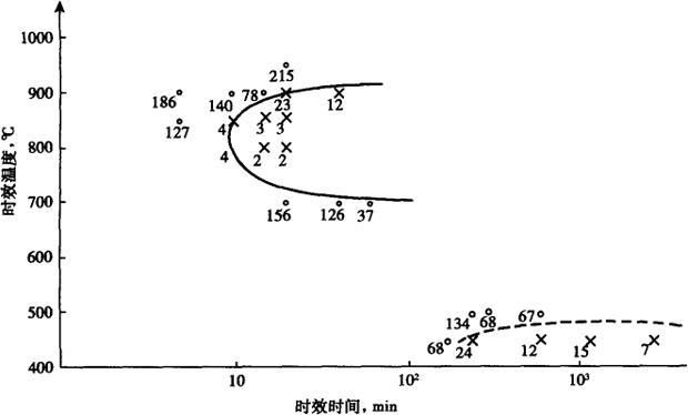 钢在不同时效温度区间的组织转变如σ相、α′相的出现对钢的力学性能有一定的影响,尤其是σ相的影响更为显着。相对组织转变的两个区域出现了钢的两个脆性区,表现为AK值降低和硬度值增高,见图4-56,4-57。