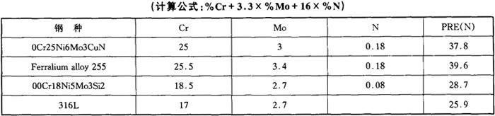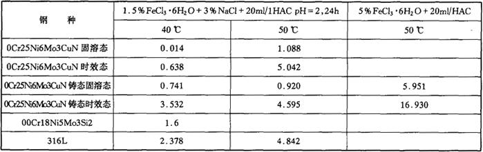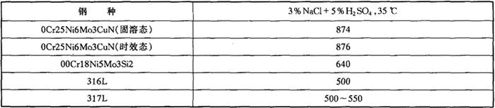 图4-57 钢经不同温度时效后硬度的变化 为了避免“475℃脆性”,0Cr25Ni6Mo3CuN钢按ASME压力容器标准的要求,长时间的使用温度不允许超过250℃。 (3)耐腐蚀性能 a.点蚀 0Cr25Ni6Mo3CuN双相不锈钢与其他钢的耐点蚀当量值对比见表4-68,说明在含氯环境中0Cr25Ni6Mo3CuN钢的耐点蚀性能优于18-5Mo型双相不锈钢,更优于316L奥氏体不锈钢。 表4-68 几种钢的耐点蚀当量值对比