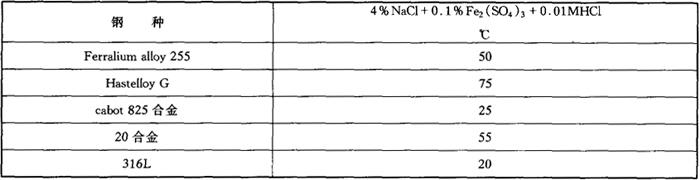 几种钢的临界孔蚀温度(CPT)的测定值见表4-71。 表4-71 在4%NaCl+0.1%Fe2(SO4)3+0.01MHCl溶液中几种材料的CPT值