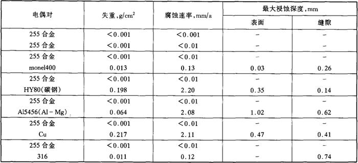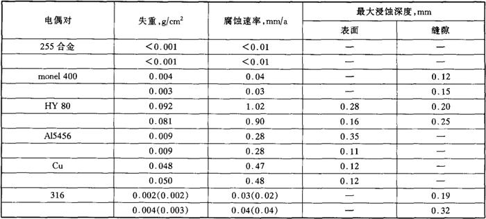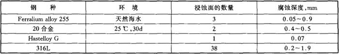 注:Hastellyo G-Ni-22Cr-19.5Fe-6.5Mo-2Cu;cabot825合金-Ni-21.5Cr-27Fe-3Mo-2Cu;20合金-Fe22Cr-26Ni-5Mo-2Cu。 b.缝隙腐蚀,电偶腐蚀 采用多面缝隙组合试样在北卡路里那的天然海水(25℃)中经30d的浸泡试验的结果列于表4-72。 表4-72 0Cr25Ni6Mo3CuN钢的缝隙腐蚀试验结果