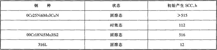 从以上可以看出Ferralium alloy 255的标样电偶对以及与其他金属组成的电偶对,失重或腐蚀速率都很低,其他金属都遭受不同程度的电偶腐蚀,即使是monel合金(Ni-Cu合金)与Ferralium alloy 255组对后,monel合金的腐蚀速率也是标样的4倍。 c.应力腐蚀 在25% NaCl+1%K2Cr2O2沸腾(108℃),pH=6的溶液中,0Cr25Ni6Mo3CuN钢的应力腐蚀试验结果见表4-75。 表4-75 几种钢的应力腐蚀试验结果(恒变形U形弯曲试样)