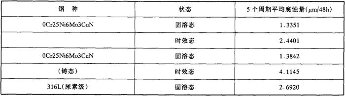 注:试验介质25%NaCl+1%K2Cr2O7沸腾(108℃)。 d.晶间腐蚀 0Cr25Ni6Mo3CuN钢的Huey法晶间腐蚀试验结果见表4-76,钢时效态的腐蚀量与316L(尿素级)相当。 表4-76 0Cr25Ni6Mo3CuN钢与316L(尿素级)钢Huey法(65%HNO3,沸腾)晶间腐蚀试验结果