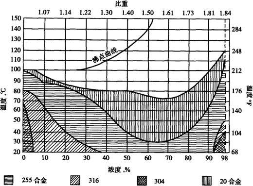 Ferralium alloy 255及其他钢种在H2SO4的等腐蚀速率图(0.5mm/a)见图4-58。