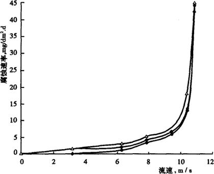 图4-58 Ferralium alloy 255在H2SO4中的等腐蚀速率图 f.磨损腐蚀 采用动态模拟实验装置——带挡板的旋转圆盘,研究了0Cr25Ni6Mo3CuN钢在3.5%NaCl溶液(55℃)中的磨损腐蚀规律,不同流速对钢的固溶态和时效态的腐蚀速率影响见图4-59。