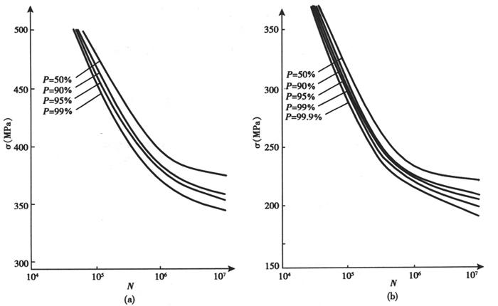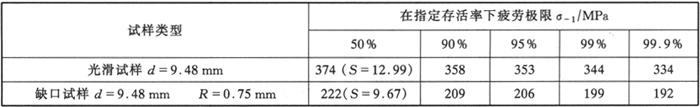 (4)疲劳和断裂 1Cr13钢的室温疲劳极限见表3-5,在指定存活率下的N-S曲线见图3-3。试验用钢化学成分为0.11C-0.29Mn-0.025P-0.009S-0.25Si-12.78Cr-0.14Ni。试样的热处理工艺为:1050℃油淬,720℃×2h空冷回水。 表3-5 指定寿命为107的1Cr13的疲劳极限