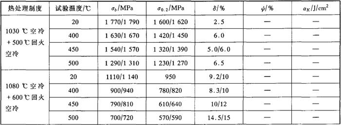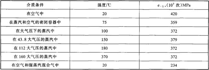 注:热处理制度:1030~1050℃油淬,680~700℃回火空冷,疲劳循环次数:107。 表3-11 在不同介质中的疲劳极限(热处理同表3-8)