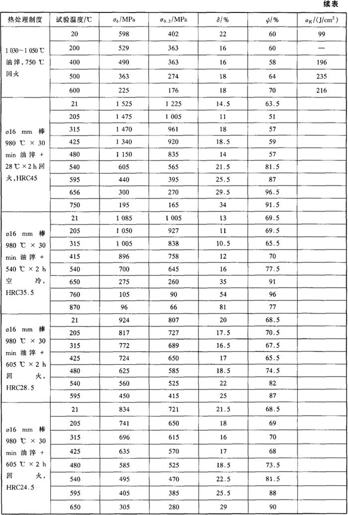 表3-7 回火温度对1Cr13高温瞬时力学性能的影响(1010℃×30min油淬,回火时间4h)