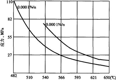 (6)持久和蠕变性能 数据见表3-8和表3-9。最小蠕变速度和应力关系曲线见图3-6。 表3-8 1Cr13钢的持久强度(1030~1050℃油淬,750℃回火空冷)