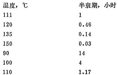 【释文】: 性质 分子量302。理论活性氧量10.6%。活化能35.4千卡/摩尔。分解温度:153℃(半衰期1分钟)、95℃(半衰期10小时)。不同温度下的半衰期: