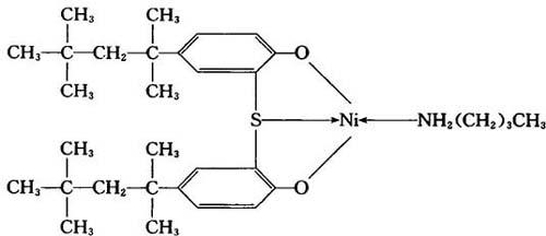 | 释义 | 2,2′-硫代双(4-叔辛基酚氧基)镍-正丁胺络合物,光稳定剂1084 【结构式】: