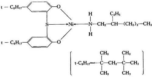 | 释义 | 2,2-硫代双(4-叔辛基酚氧基)镍-2-乙基己胺络合物 【结构式】: