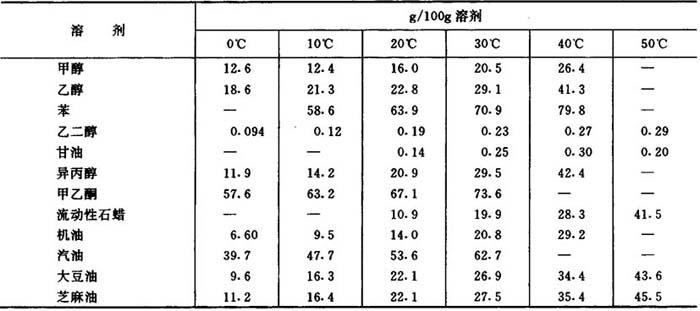 【释文】: 制法 由对甲基苯酚与异丁烯或异丁醇进行烷基化而得。 性质 白色或浅黄色结晶粉末或片状物。分子量220。相对密度1.05左右。熔点69~71℃。沸点257~265℃。闪点127℃。蒸气压267Pa(100℃)、4000(160℃)、17329Pa(200℃)。溶于苯、甲苯、醇、酮、四氯化碳、醋酸乙酯和汽油等溶剂,不溶于水和稀烧碱溶液,表4-1为本品在部分溶剂中的溶解度。 表4-1 2,6-二叔丁基-4-甲基苯酚的溶解度