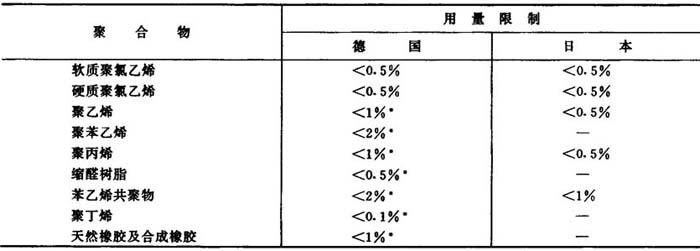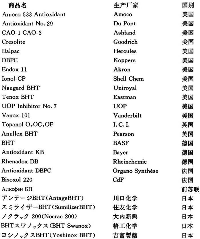 根据联合国粮食与农业组织-世界卫生组织联合食品添加物专门委员会的报告(No40ABC1967),人体每日摄入2,6-二叔丁基-4-甲基苯酚的最大无害量为: 无附加条件时 0~0.5mg/kg体重 有附加条件时 0.5~2mg/kg体重 许多国家允许本品用于食品包装材料,如英国、法国(最大用量为0.125%)、美国(参见FDA121.2001)、日本和德国等。表4-2为德国和日本对本品用于各种聚合物时的用量限制。 国内生产厂 上海向阳化工厂 锦州石油六厂 辽阳滨河化工厂 兰州化学工业公司有机厂 北京助剂总厂 表4-2 2,6-二叔丁基-4-甲基苯酚在聚合物中的用量限制
