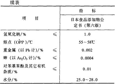 鉴别方法 本品应呈现邻苯基苯酚反应和钠盐反应。 1.邻苯基苯酚反应 按邻苯基苯酚的鉴别方法进行。 2.钠盐反应 焰色反应呈黄色。 毒理学依据 1.LD50 大鼠口服1.55~1.65g/kg(bw)。 小鼠口服1.018g/kg(bw)(雄性); 0.812g/kg(bw)(雌性)。 2.ADI 0~0.2mg/kg(bw) (FAO/WHO,1994)。 使用 水果贮藏期防腐剂、防霉剂。 1.使用注意事项 (1)邻苯基苯酚钠没有植物毒性。 (2)邻苯基苯酚钠为强碱弱酸盐,可水解,并能选择性地扩散到果皮破伤部位(伤口部位酸性较强)。这种SOPP 2.使用范围及使用量 我国《食品添加剂使用卫生标准》(GB 2760-1996)规定:用于柑橘保鲜,最大使用量为0.95g/kg,残留量应小于12mg/kg。 |