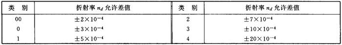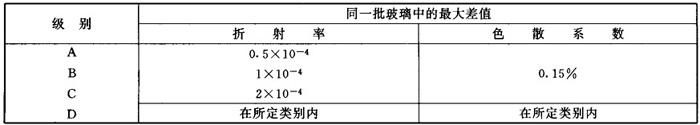 表1-3和表1-4中的4类仅适用于nd大于1.82的玻璃。 2.2.1.2 根据同一批玻璃中,折射率及色散系数的最大差值,玻璃的一致性按表1-5分为4级。 表1-5 玻璃一致性的分级
