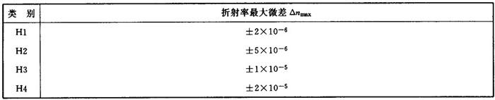注:α0代表平行光管的理论分辨率;α代表玻璃放入平行光管后的分辨率。 2.2.2.2 玻璃的光学均匀性以一块玻璃中各部位间的折射率微差最大值△nmax表示时,按表1-7分为4类。 表1-7