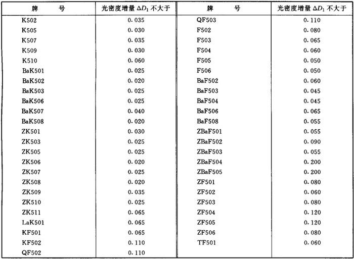 2.2.7 耐辐射性能 2.2.7.1 名词术语 (1)耐辐射玻璃。在高能辐射(如γ射线、χ射线及宇宙射线)作用下,具有一定抗辐射稳定性(不易着色或变暗)的光学玻璃称为耐辐射玻璃。耐辐射玻璃在无色光学玻璃国标中属N系列。 耐辐射玻璃的牌号是这样规定的:例如K9是普通光学玻璃,而K509则表示光学常数与K9玻璃相同,但它能耐1×105R(伦琴)剂量的γ射线或χ射线的辐照。 (2)光密度。假定一束白光通过透明介质时的透过率为τ(既考虑了吸收损失,也考虑了介质两表面的反射损失)。我们把τ的对数(以10为底)的负值称为光密度,用D表示,即D=-lgτ。例如τ=0.1,D=1;τ=0.01,D=2。光密度数值越大,表示透明介质的透过率越低。 2.2.7.2 耐辐射性能 耐辐射光学玻璃的耐辐射性能,用总剂量为1×105R(伦琴)的χ射线辐照玻璃后的每厘米厚度上的光密度增量△D1来表示,应符合表1-15的规定。 表1-15 耐辐射玻璃的光密度增量