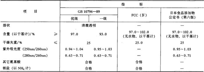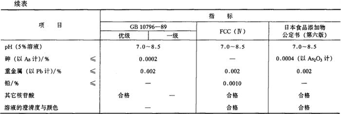 C10H12N5Na2O8P·xH2O 相对分子质量 407.19(无水) 性状 无色至白色结晶,或白色结晶性粉末,含约7分子结晶水。味鲜,鲜味阈值为0.0125g/100mL,鲜味强度为肌苷酸钠的2.3倍。与谷氨酸钠合用有很强的协同作用。不吸湿,溶于水,水溶液稳定。在酸性溶液中,高温时易分解,可被磷酸酶分解破坏,稍溶于乙醇,几乎不溶于乙醚。 制法 (1)由酵母所得核酸分解、分离制得。 (2)由发酵法制取。 质量标准
