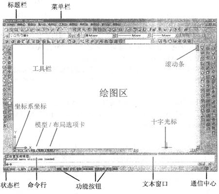 | 释义 | AutoCAD用户界面及操作 (一)AutoCAD2005界面操作 AutoCAD软件的最新版本为AutoCAD2005,其工作界面如图4-36所示,通常由五块组成,最上方为标题栏和菜单栏,最下方为命令提示行及状态栏,左侧及菜单栏下方为工具栏,右侧为能控制绘图区移动的滚动条,中间大块空间为绘图区,并带有坐标系、光标及模型/布局等。