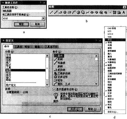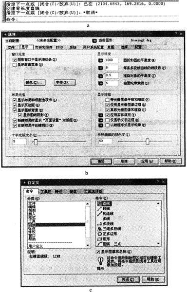图4-37 工具栏操作 a.“新建工具栏”对话框 b.“绘图”工具栏 c.“自定义”工具栏 d.光标菜单 通常,启动AutoCAD工具栏后,主窗口中仅显示“标准”工具栏、“对象特性”工具栏、“修改”及“绘图”工具栏(图4-37b),其中前两个工具栏放在绘图区的上边,后两个工具栏放在绘图区左边。 AutoCAD2005采用浮动的方式放置,可放置在窗口的任意位置,以便根据需要移动光标箭头于工具栏边缘,按下鼠标左键并移动,将工具栏随光标移动到窗口的其他位置。 AutoCAD2005也可通过自定义工具栏的方式改变工具栏中的内容(图4-37c),或通过选择“工具”/“自定义”命令隐藏或显示某些工具栏,还可以在打开或关闭工具栏时,移动光标到任意一个工具栏上,单击鼠标右键便弹出光标菜单(图4-37d),列出所有工具栏的名称,若名称前带有“√”标记,则表示该工具栏已打开,选择菜单上某一选项,打开或关闭相应的工具栏。 4.命令提示行操作 命令行是通过键盘输入命令、数据等显示的地方,用户通过菜单和工具栏执行的命令,也将在命令行中显示命令的执行过程,按F2键打开命令窗口,如图4-38a所示,此窗口中将显示更多的历史命令,若再次按F2键便可关闭窗口。在默认设置下,仅显示3条命令,但可在“选项”对话框的“显示”选项卡中设置命令提示行的行数,并单击“工具”/“选项”命令即可打开“选项”对话框(图4-38b)。