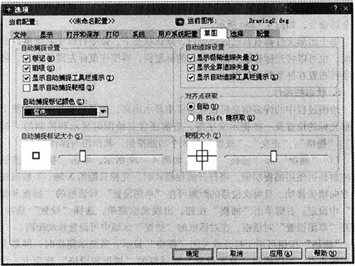 图4-40 设置极坐标捕捉模式和自动追踪功能 a.设置捕捉角度增量 b.“对象捕捉”选项卡 (3)“对象捕捉”按钮:用于控制打开或关闭自动捕捉实体模式。若打开此模式,则AutoCAD在绘图过程中将自动捕捉圆心、端点、中点等几何点,且用户可在“草图设置”对话框的“对象捕捉”选项卡中设定自动捕捉方式(图4-40b)。 (4)“对象追踪”按钮:用于控制是否使用自动追踪功能,该功能的设置可以在“对象捕捉追踪设置”区域中完成(图4-40a)。 所谓自动追踪,是指当AutoCAD自动捕捉到图形中某点后,再以这个点为基准点,沿着水平和竖直正交或某一极坐标方向寻找另一点,并在其追踪方向上显示一条追踪线。 (5)“模型/布局”按钮:“模型/布局”选项卡用于在模型空间和布局(图纸)空间来回切换图形。模型空间用于设计图形,布局空间用于打印图形。当处于模型空间时,单击此按钮即可切换到图纸空间,按钮也变为“图纸”按钮,再次单击则可进入浮动模型视口,亦即进入在图纸空间的模拟图纸上创建的可移动视口,通过该视口即可观察到模型空间的图形,并能进行绘图及编辑操作。 操作时可以改变浮动模型视口的大小,还可将其复制到图纸的其他地方。进入图纸空间后,AutoCAD将自动创建一个浮动模型视口,若要激活它,可以单击“图纸”按钮。 (二)图形文件的创建与管理 1.新图形文件的创建 在AutoCAD2005中创建新图形文件时,使用默认图形样板文件中的设置,若在系统的“选项”对话框中设置了显示“启动”对话框(图4-41),启动AutoCAD2005后会自动显示如图4-42a所示的默认设置“启动”对话框。再根据需要在对话框中选择“向导”、“样板”或“默认设置”等不同方式建立新的图形文件。