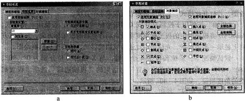 图4-39 “草图设置”对话框 “栅格”按钮可用于打开或关闭“栅格”显示。当显示栅格时,屏幕上将布满小点,可以通过“草图设置”对话框的“捕捉和栅格”选项卡,设置栅格的X轴、Y轴的间距。 (2)“正交”和“极轴”按钮:“正交”按钮用于控制是否以正交方式绘图,若打开此模式,只能绘制垂直直线或水平直线。 “极轴”按钮用于控制打开或关闭极坐标捕捉模式,若使用这种模式,AutoCAD将根据设定的极坐标角度增量自动计算新的极坐标方向,并在该方向上显示一条追踪线,光标将沿此追踪线精确移动,从而进行精确绘图。 默认情况下,系统预设了4个极轴,与X轴的夹角分别为0°、90°、180°、270°。可以通过“草图设置”对话框的“极轴追踪”选项卡设置捕捉的角度增量,如图4-40a所示。