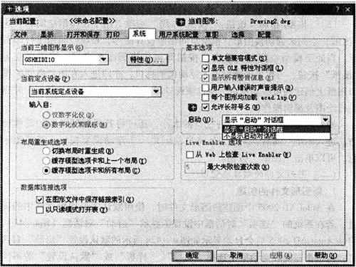 图4-41 选择“显示‘启动’对话框”选项 (1)选用“默认设置”:单击“打开”按钮右侧的下三角按钮,弹出如图4-42b所示的附加菜单,用户可以使用默认的方式创建新图形,并可选择英制单位或公制(即国际制)单位。 (2)选用“向导”:单击图4-42c上部的右侧按钮,呈现“使用向导”,并在“选择向导”栏中出现两个选项,快速设置和高级设置,前者将提示用户设置作图单位及绘图区域大小,而后者则一步步提示用户设置长度单位及精度、作图区域大小、角度单位及精度、角度测量的起始方向、角度测量顺时针或逆时针的正方向。