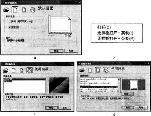 图4-42 创建新图形对话框及其操作 a.“启动”对话框 b.默认方式创建新图形 c.利用“向导”创建新图形 d.利用“样板”创建新图形 (3)选用“样板”:AutoCAD2005提供了一系列标准样板文件,样板文件中包含了绘图所需的各种设置,如图层、单位类型及精度、标题栏、边框、文本样式、标注样式等项目,用户可以选择一种或创建自定义样板文件。 如图4-42d所示,单击图上部的中间按钮,即可在“选择样板”列表框中选取样板图创建新图形,而且利用样板文件创建新图样时,当前图形的绘图设置将与样板图完全相同。 若用户在“选项”对话框中选择“不显示启动对话框”选项,可以单击标准工具栏的新建按钮,弹出如图4-43所示的“选择样板”对话框。